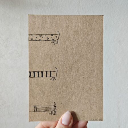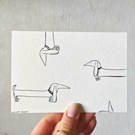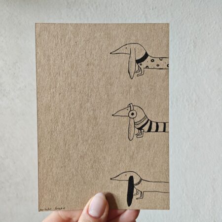 Obrazek z jamniczkiem ręcznie rysowany cienkopisem kreślarskim na papierze o gramaturze 300 g/m²