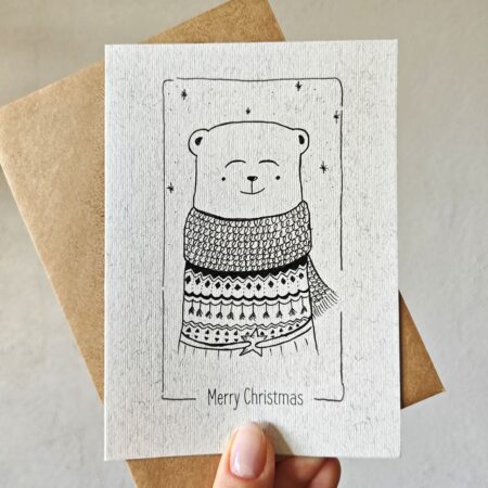 Składana kartka świąteczna z zimowym misiem ręcznie rysowana cienkopisem kreślarskim na papierze o gramaturze 300 g/m²