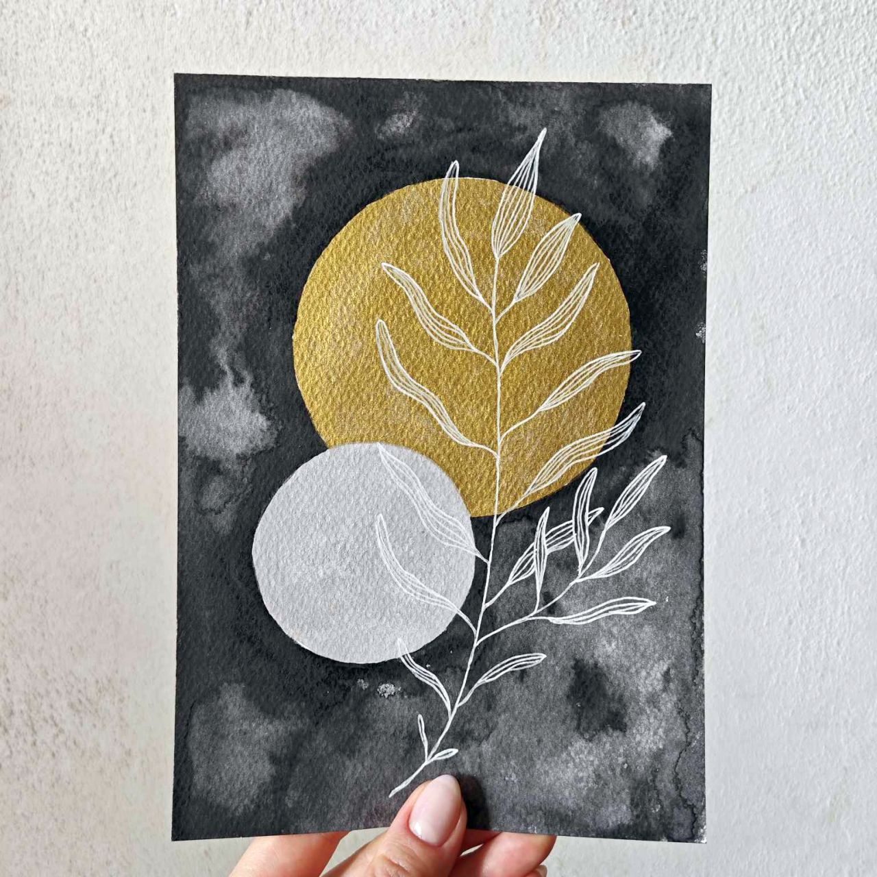 Białe liście, symbol czystości i spokoju, w połączeniu z złotymi kołami, tworzą niebanalny obraz, który przeniesie Cię w świat abstrakcyjnej harmonii natury.