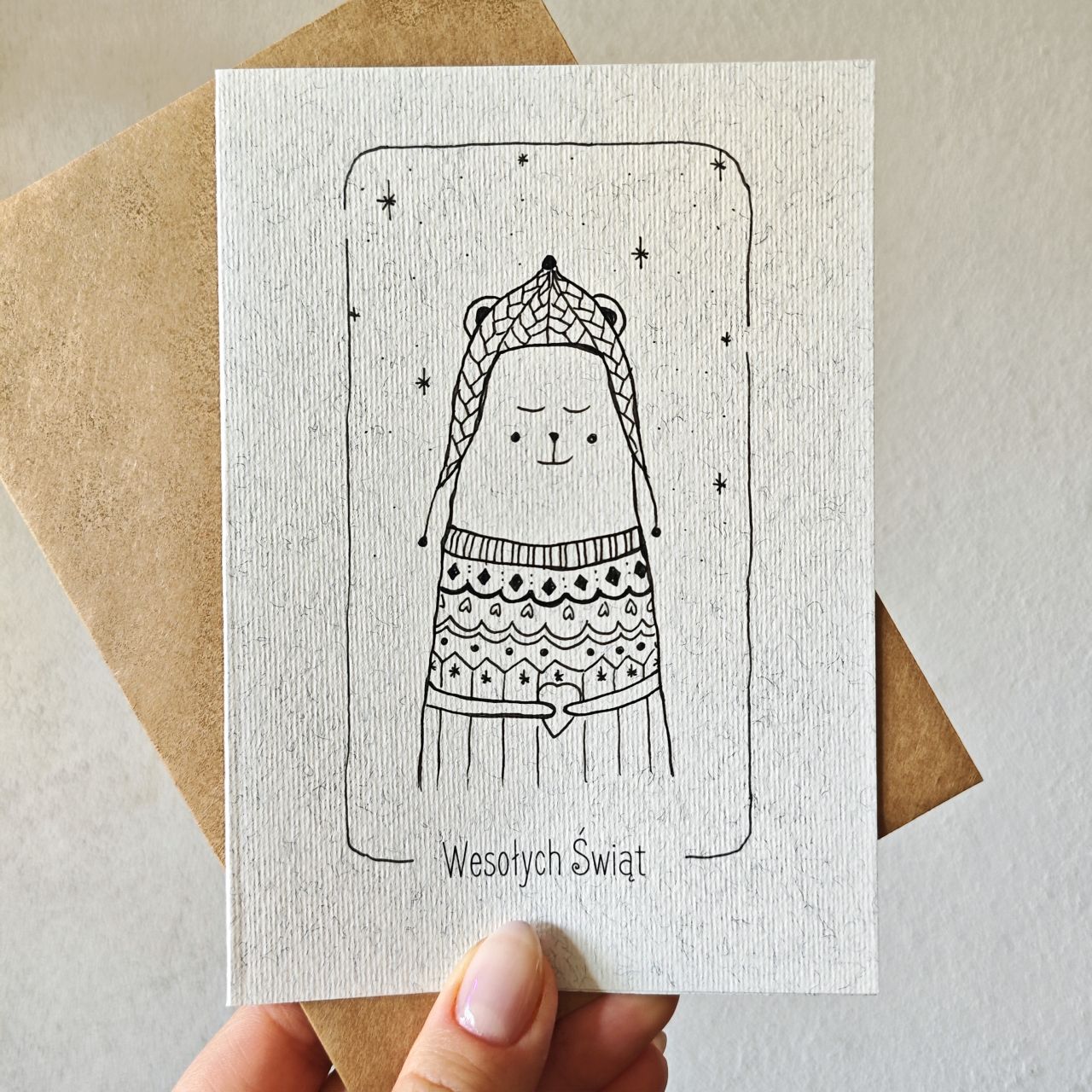 Składana kartka świąteczna z zimowym misiem IV to autorska ilustracja ręcznie rysowana cienkopisem kreślarskim na papierze o gramaturze 300 g/m2.