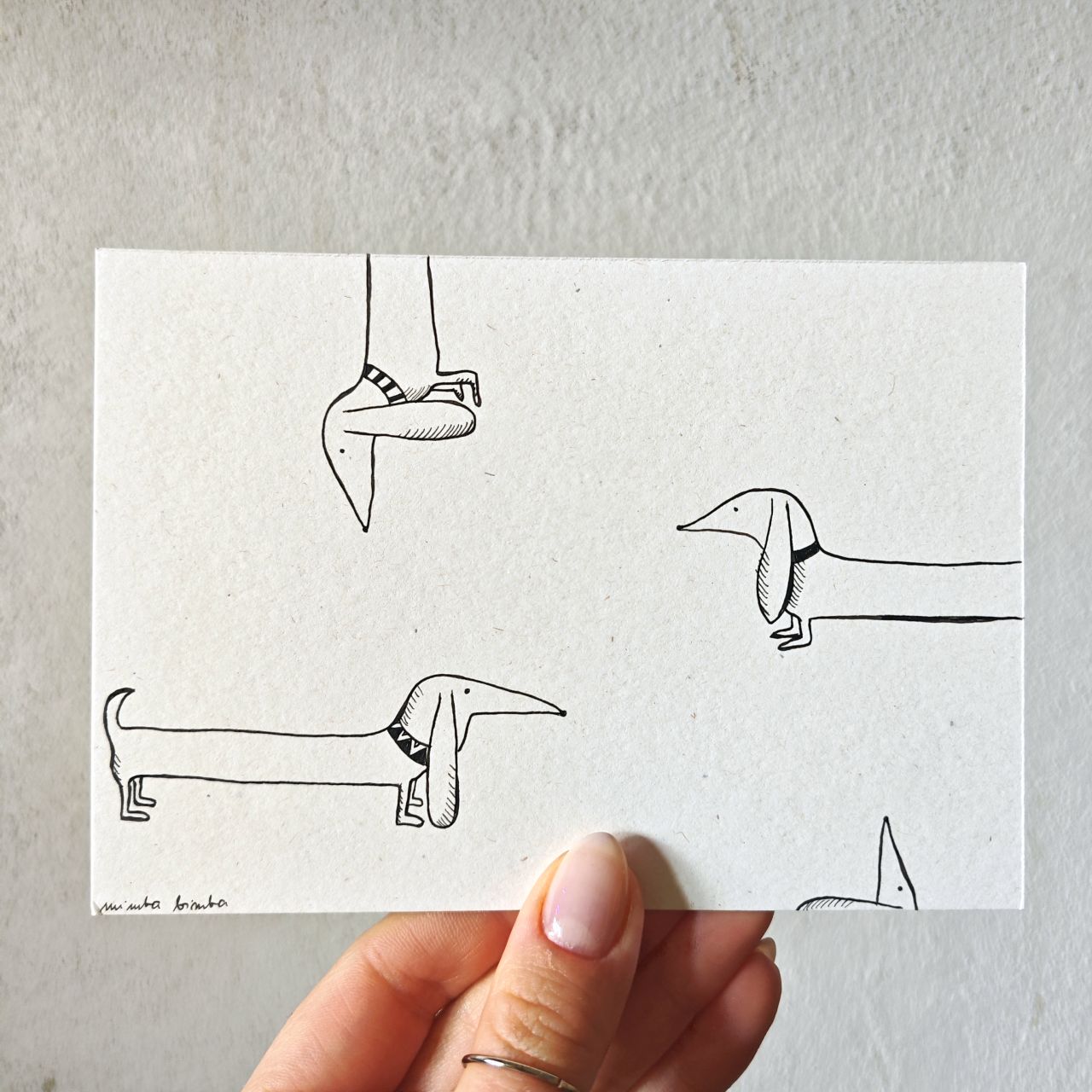Obrazek z jamniczkami I to autorska ilustracja ręcznie rysowana cienkopisem kreślarskim na papierze o gramaturze 300 g/m2.